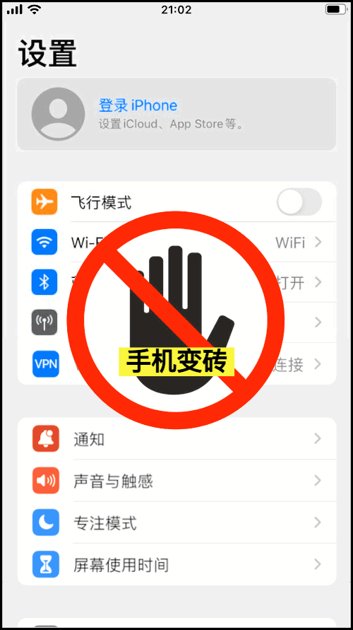 千万别在 iCloud 页面和设置页面登录! 这会导致您的 App Store 和 iTunes Store 被停用 或 锁定,最严重会导致 “手机会变砖”;