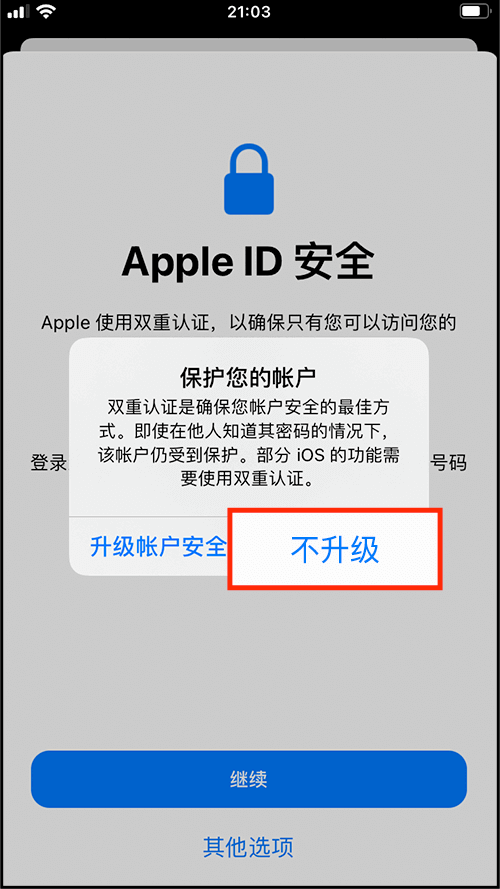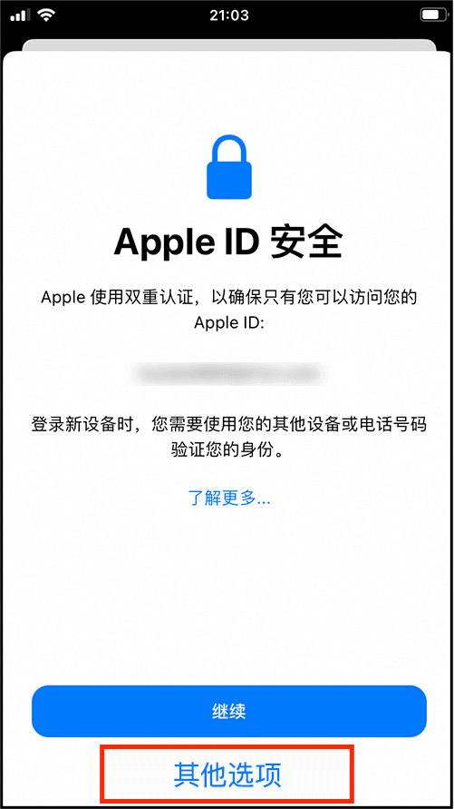 3. 登录ID后,会弹出Apple ID安全页面,切记,请点击其他选项,若没有此提示请忽略;