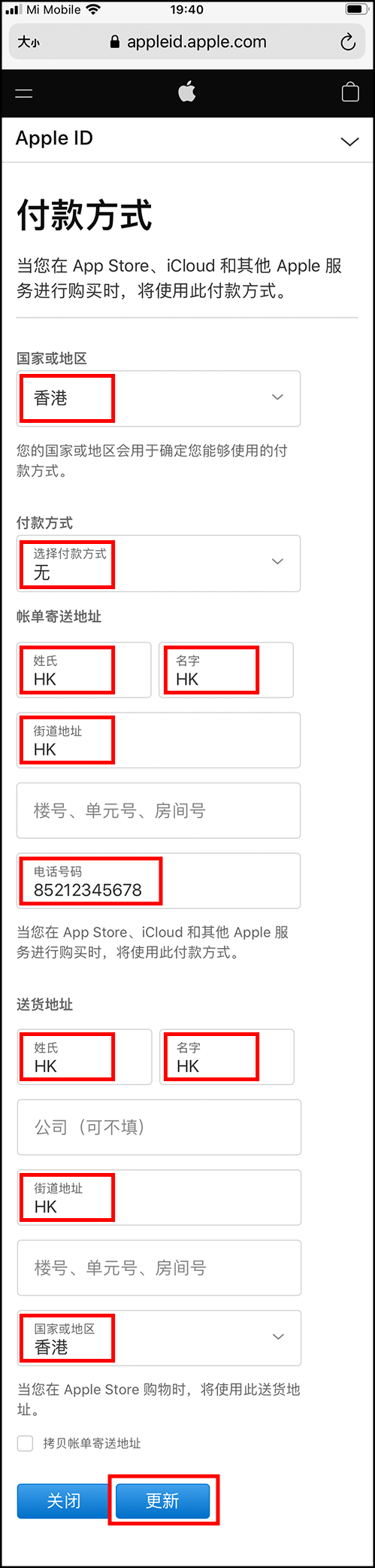 账单寄送地址:姓氏、名字、街道地址随意填写
