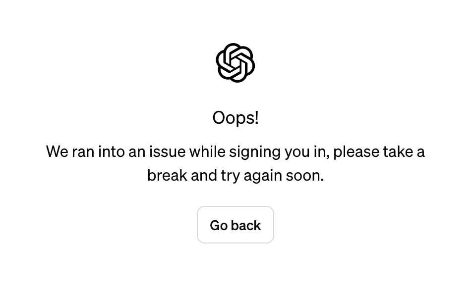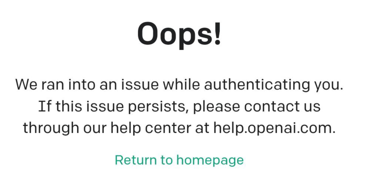 Oops! We ran into an issue while authenticating you. If this issue persists, please contact us through our help center at help.openai.com.