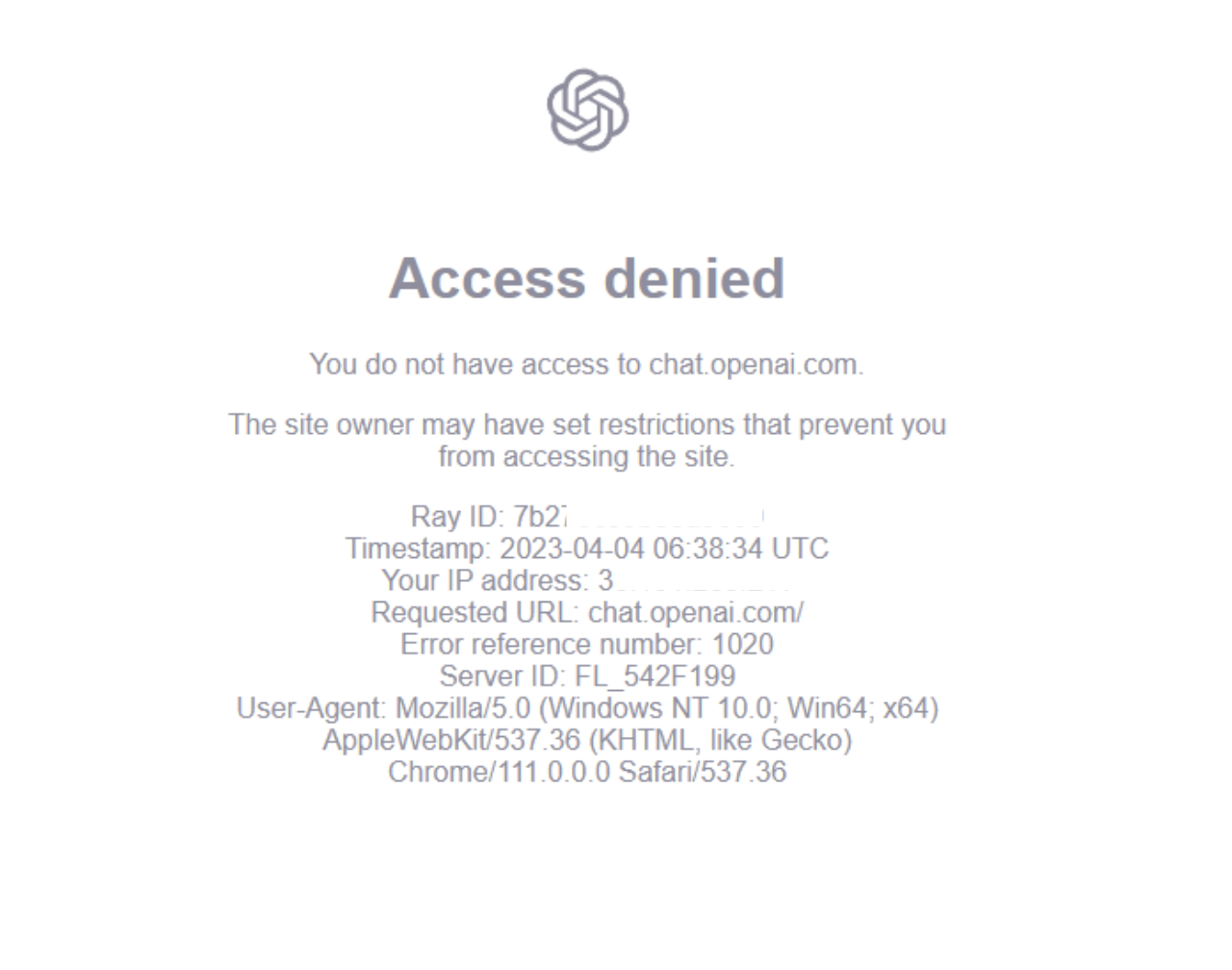 中文意思:拒绝访问,您无权访问 chat.openai.com。网站所有者可能设置了阻止您的限制