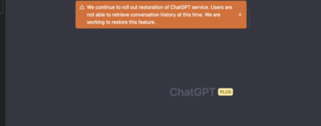 中文意思:我们继续推出 ChatGPT 服务的恢复。用户目前无法检索对话历史记录。我们正在努力恢复此功能