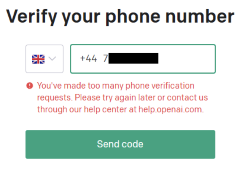 You've made too many phone verification requests. Please try again later or contact us through our help center at help.openai.com.