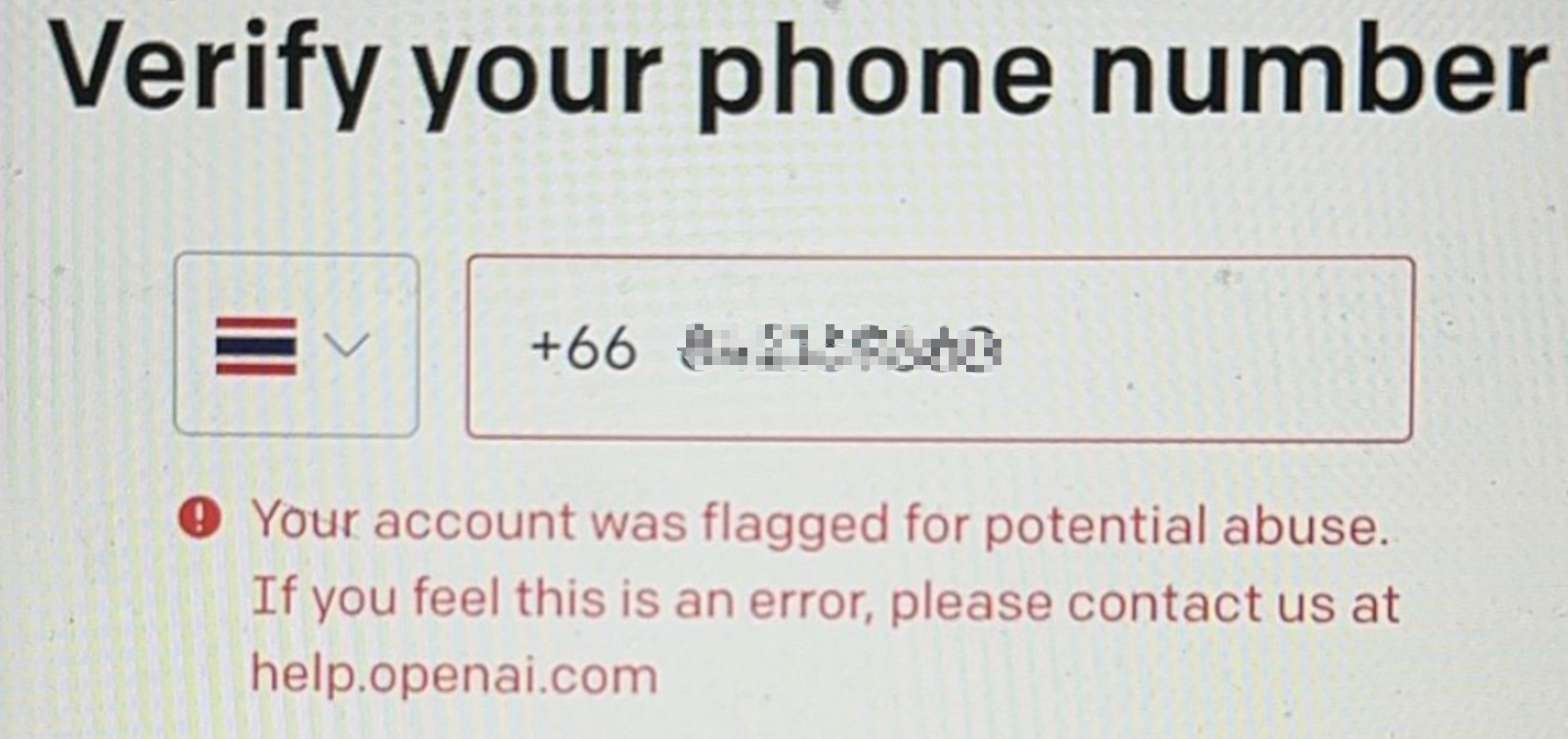 Your account was flagged for potential abuse.If you feel this is an error, please contact us at help.openai.com